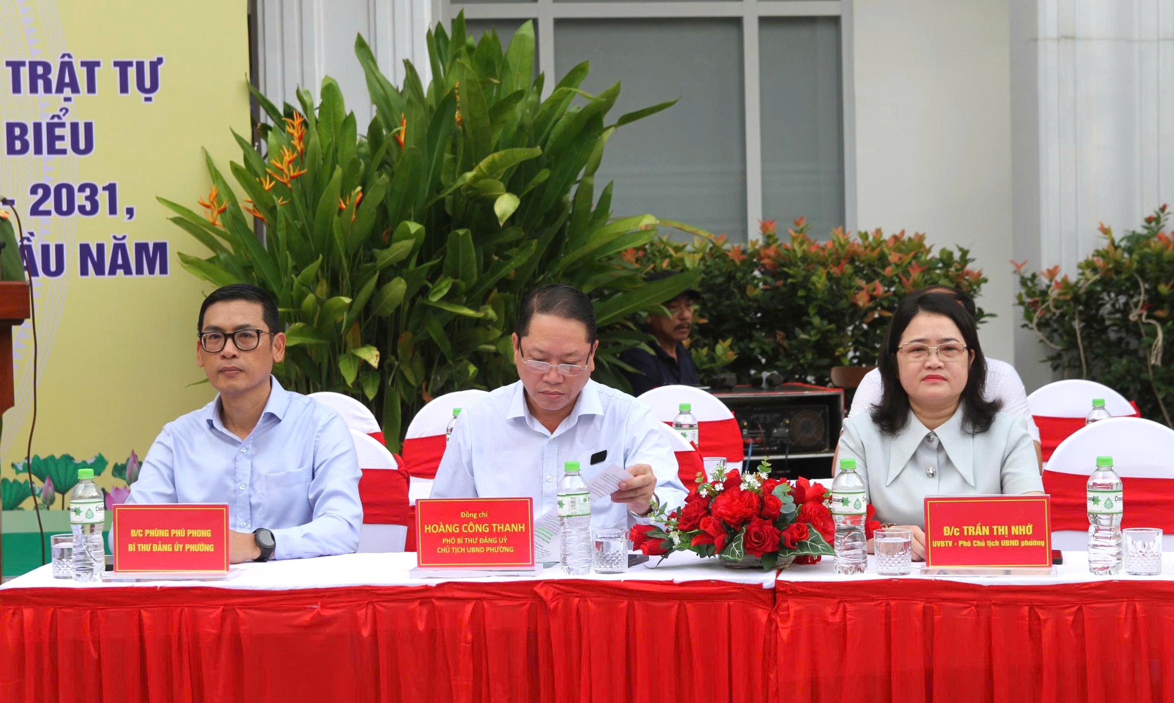 Đồng chí Phùng Phú Phong - Bí thư Đảng uỷ, Chủ tịch HĐND lâm thời phường; đồng chí Hoàng Công Thanh - Phó Bí thư Đảng uỷ, Chủ tịch UBND phường; đồng chí Trần Thị Nhớ - Uỷ viên BTV, Phó Chủ tịch Thường trực UBND phường đã về dự Lễ ra quân.