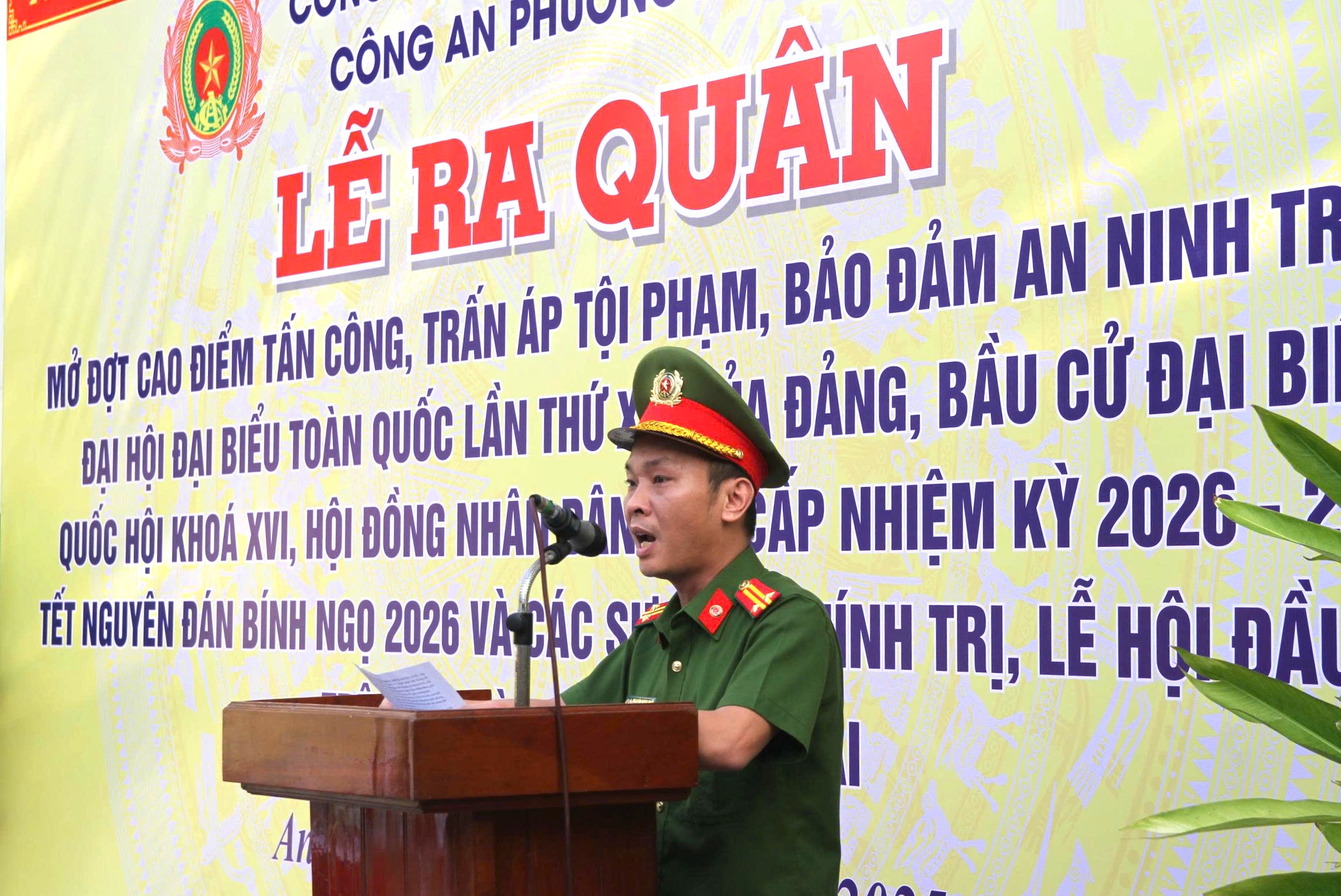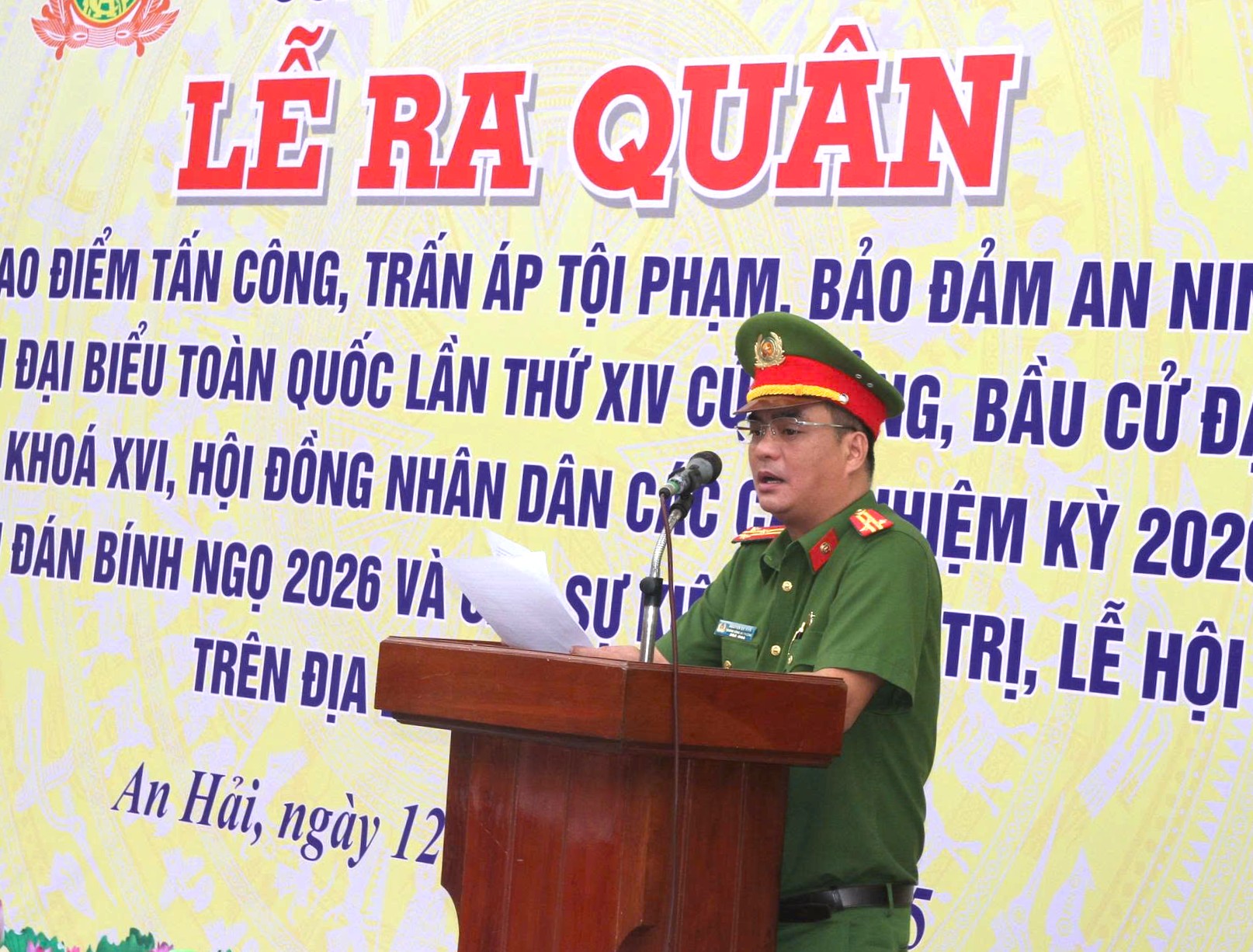 Phát biểu giao nhiệm vụ cho lực lượng tại Lễ ra quân, đồng chí Hoàng Công Thanh - Phó Bí thư Đảng uỷ, Chủ tịch UBND phường đề nghị Công an phường ra sức lập công, thể hiện tốt vai trò xung kích, đi đầu trên mặt trận đấu tranh, đảm bảo an ninh quốc gia, giữ gìn trật tự an toàn xã hội, trật tự an toàn giao thông, phòng chống cháy, nổ trên địa bàn, xứng đáng là "thanh bảo kiếm", "lá chắn thép" vững chắc của Đảng, chính quyền và Nhân dân; Chủ động đấu tranh, ngăn chặn, làm thất bại mọi âm mưu, hoạt động chống phá của các thế lực thù địch, phản động, bảo vệ an toàn tuyệt đối các sự kiện chính trị, các đoàn khách trong và ngoài nước đến địa bàn phường; tuyệt đối không để xảy ra các tụ điểm phức tạp, điểm nóng về an ninh trật tự trên địa bàn phường; Tăng cường phối hợp, huy động tối đa và phát huy vai trò của các lực lượng nòng cốt ở địa phương trong công tác đảm bảo an ninh trật tự, đấy mạnh phong trào "Toàn dân bảo vệ An ninh Tổ quốc" trên địa bàn; Đẩy mạnh công tác bảo đảm trật tự đô thị, trật tự an toàn giao thông; kiên quyết xử lý tình trạng lấn chiếm lòng lề đường, vỉa hè, kinh doanh hàng rong gây mất mỹ quan và tiềm ẩn nguy cơ mất an toàn; xây dựng hình ảnh phường An Hải văn minh, sạch đẹp, an toàn, thân thiện trong mắt người dân và du khách.
