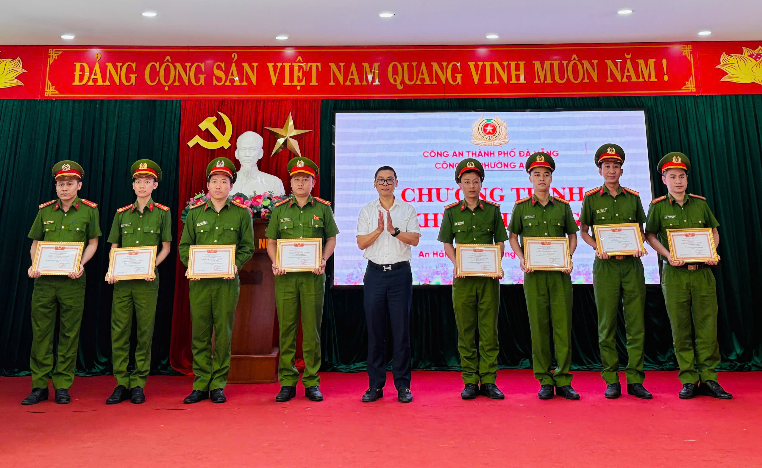 Về dự Hội nghị có Đại tá Nguyễn Thành Long - Phó Giám đốc Công an thành phố Đà Nẵng; đồng chí Phùng Phú Phong - Bí thư Đảng uỷ, Chủ tịch HĐND lâm thời phường An Hải. Dự Hội nghị còn có các đồng chí: Trần Thị Nhớ - Uỷ viên BTV Đảng ủy, Phó Chủ tịch Thường trực UBND phường; Đặng Đình Hưởng - Uỷ viên BTV Đảng uỷ, Chủ tịch Uỷ ban MTTQ Việt Nam phường; đại diện lãnh đạo các phòng, Trung tâm thuộc phường, đại diện lãnh đạo Hội Cựu Công an Nhân dân phường cùng cán bộ, chiến sĩ Công an phường.