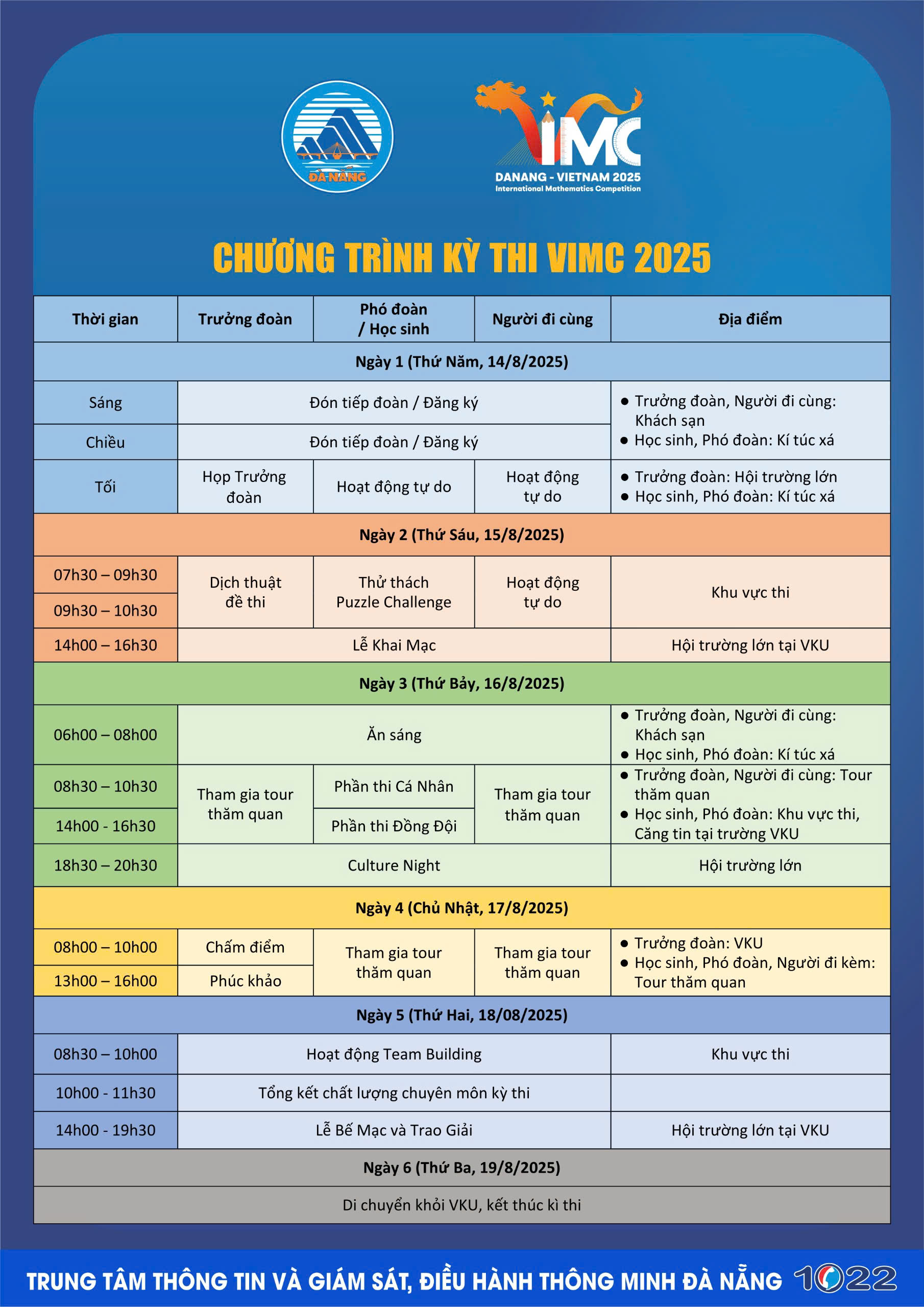 Kỳ thi chính thức được tổ chức trong ngày 16/8/2025; đối tượng dự thi là học sinh lớp 5, 6 và học sinh lớp 7, 8 năm học 2024-2025. Các thí sinh sẽ trải qua 2 vòng thi: Cá nhân và Đồng đội, bao gồm giải biện, biện luận để đạt điểm thi tối đa về Toán học. Bên cạnh đó, trong khuôn khổ kỳ thi còn có hội thảo chuyên đề giảng dạy, thi cử, đổi mới về chương trình cho đoàn giáo viên; hội thảo chuyên đề về công nghệ và AI dành cho giảng viên và sinh viên đại học; hoạt động giao lưu và trao đổi văn hóa học sinh, giáo viên quốc tế giữa 31 quốc gia; giao lưu với học sinh THCS của thành phố Đà Nẵng và chương trình tham quan, trải nghiệm./.