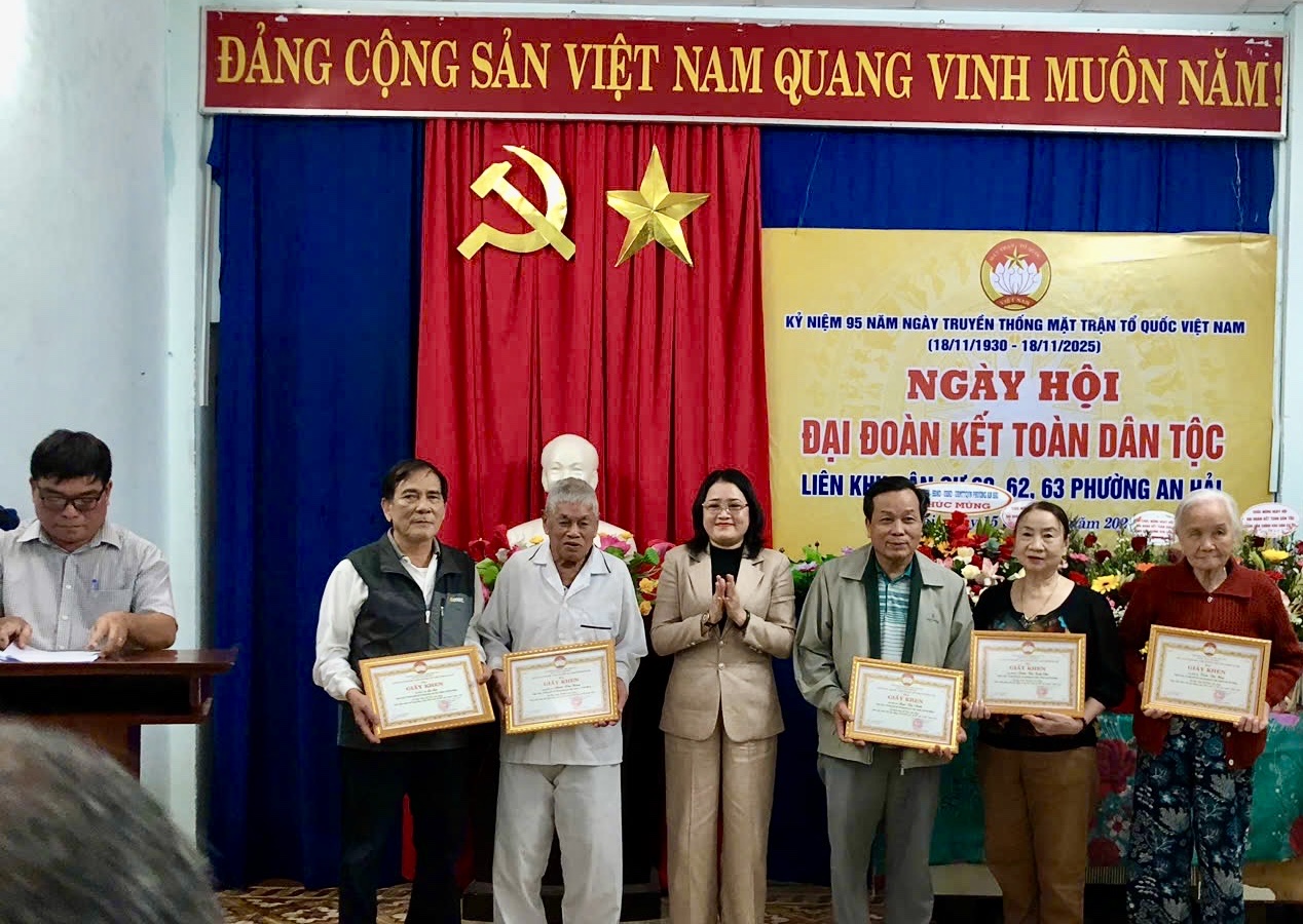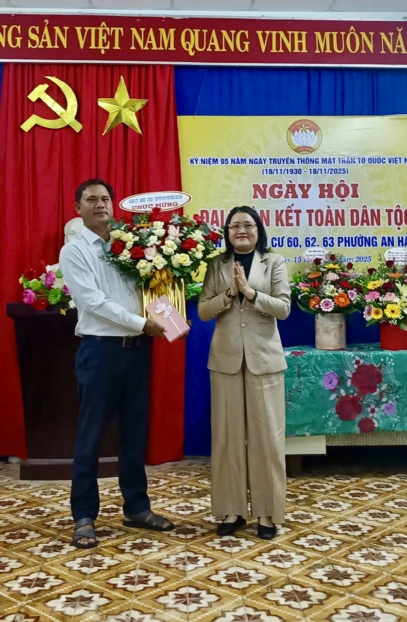 Tối 15/11, tại Nhà sinh hoạt cộng đồng số 71 đường Sương Nguyệt Ánh, liên Khu dân cư 60, 61 và 62 phường An Hải tổ chức Ngày hội Đại đoàn kết toàn dân tộc năm 2025, chào mừng kỷ niệm 95 năm Ngày Truyền thống Mặt trận Tổ quốc Việt Nam (18/11/1930 - 18/11/2025). Uỷ viên Ban Thường vụ Đảng uỷ, Phó Chủ tịch Thường trực UBND phường An Hải - Trần Thị Nhớ đã về dự, tặng hoa và quà chúc mừng và chung vui cùng bà con Nhân dân các khu dân cư.