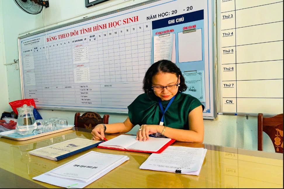 Trong căn phòng làm việc giản dị ở tầng một của ngôi trường vùng biển, cô Nguyễn Thị Mỹ Linh -  Phó Bí thư Chi bộ, Phó Hiệu trưởng nhà trường, vẫn miệt mài rà soát từng chi tiết trong kế hoạch công tác tháng 8/2025. Trên bàn, từng mục tiêu, từng mốc thời gian, từng phần việc đều được ghi chú rõ ràng, cẩn trọng. Không ồn ào, không phô trương, phong cách lãnh đạo của cô được định hình bằng tư duy hệ thống, sự chuẩn bị kỹ lưỡng và tinh thần trách nhiệm cao.