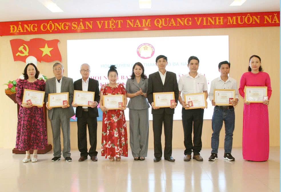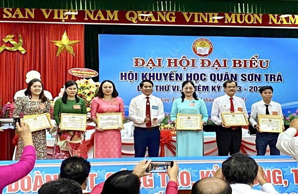 Cô Nguyễn Thị Mỹ Linh (thứ ba từ trái sang) nhận giấy khen của Hội khuyến học Quận Sơn Trà năm học 2023-2024