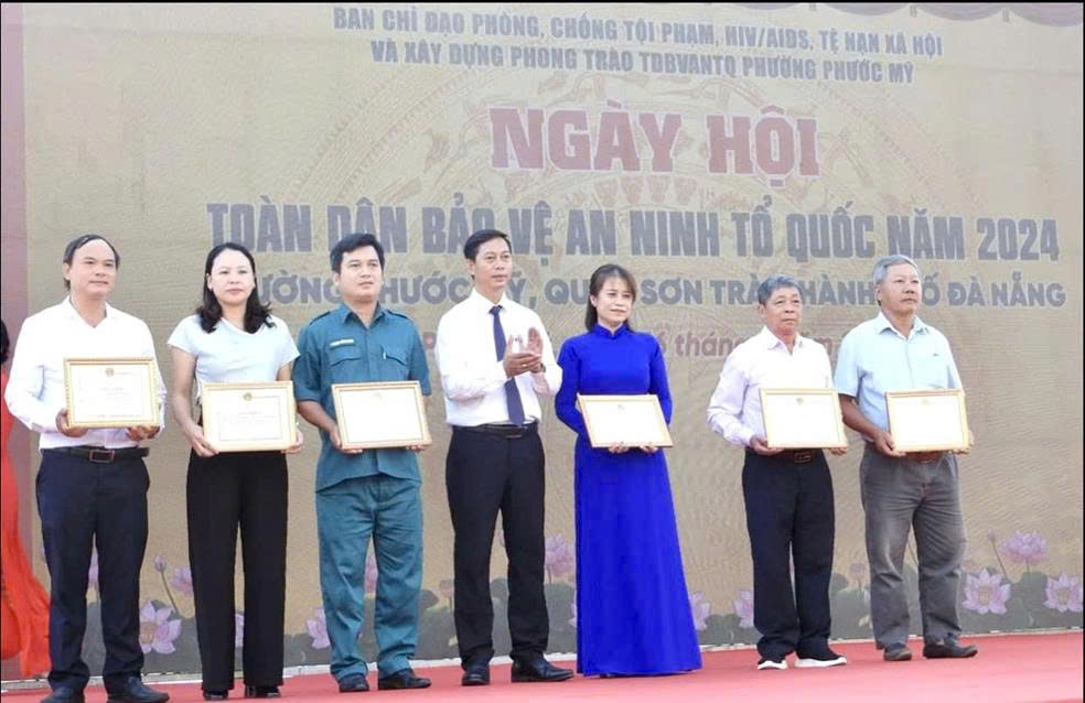Cô Nguyễn Thị Mỹ Linh (thứ hai từ trái sang) nhận giấy khen Có thành tích xuất sắc trong phong trào Toàn dân bảo vệ an ninh Tổ quốc năm 2024” của Chủ tịch UBND phường Phước Mỹ