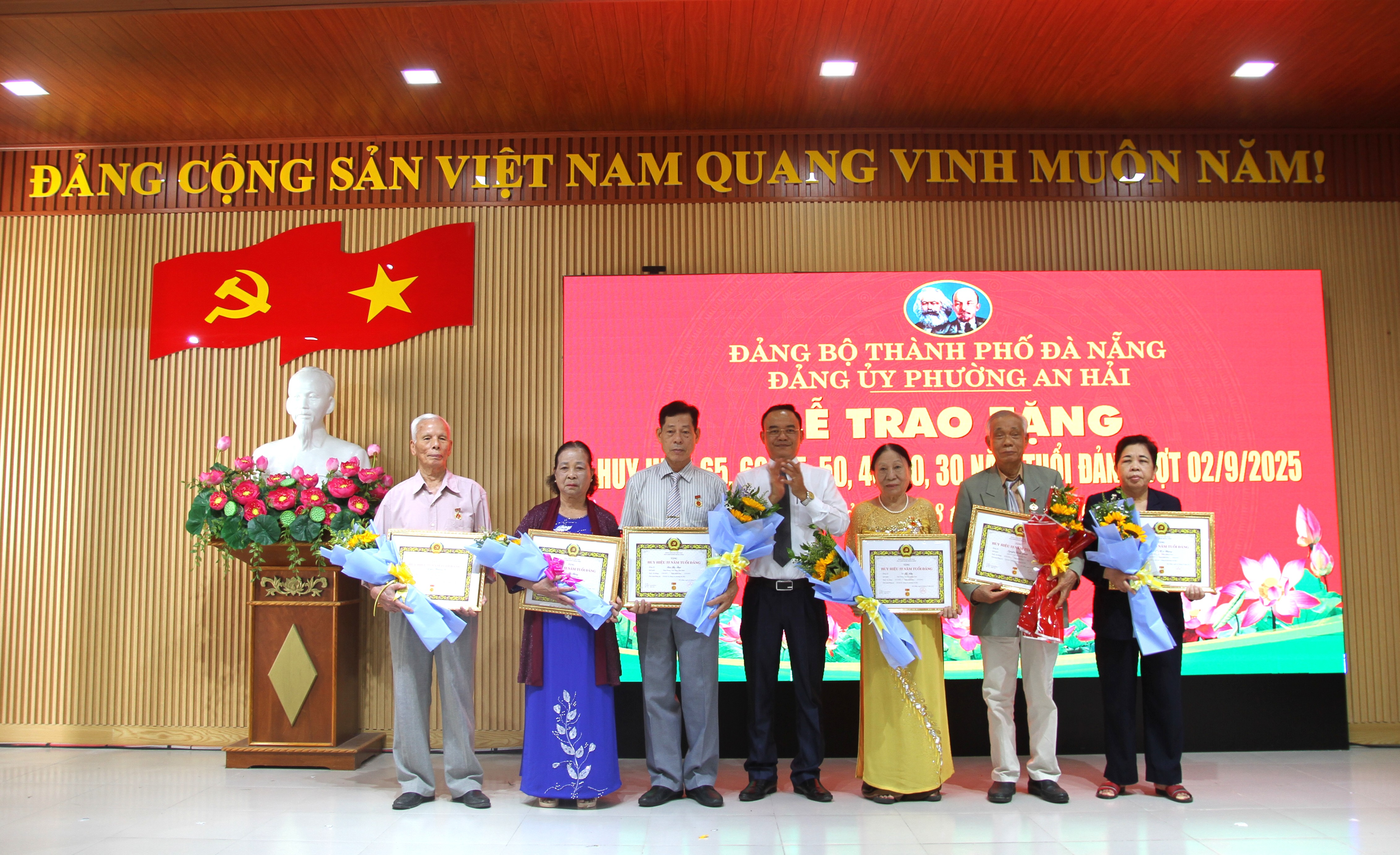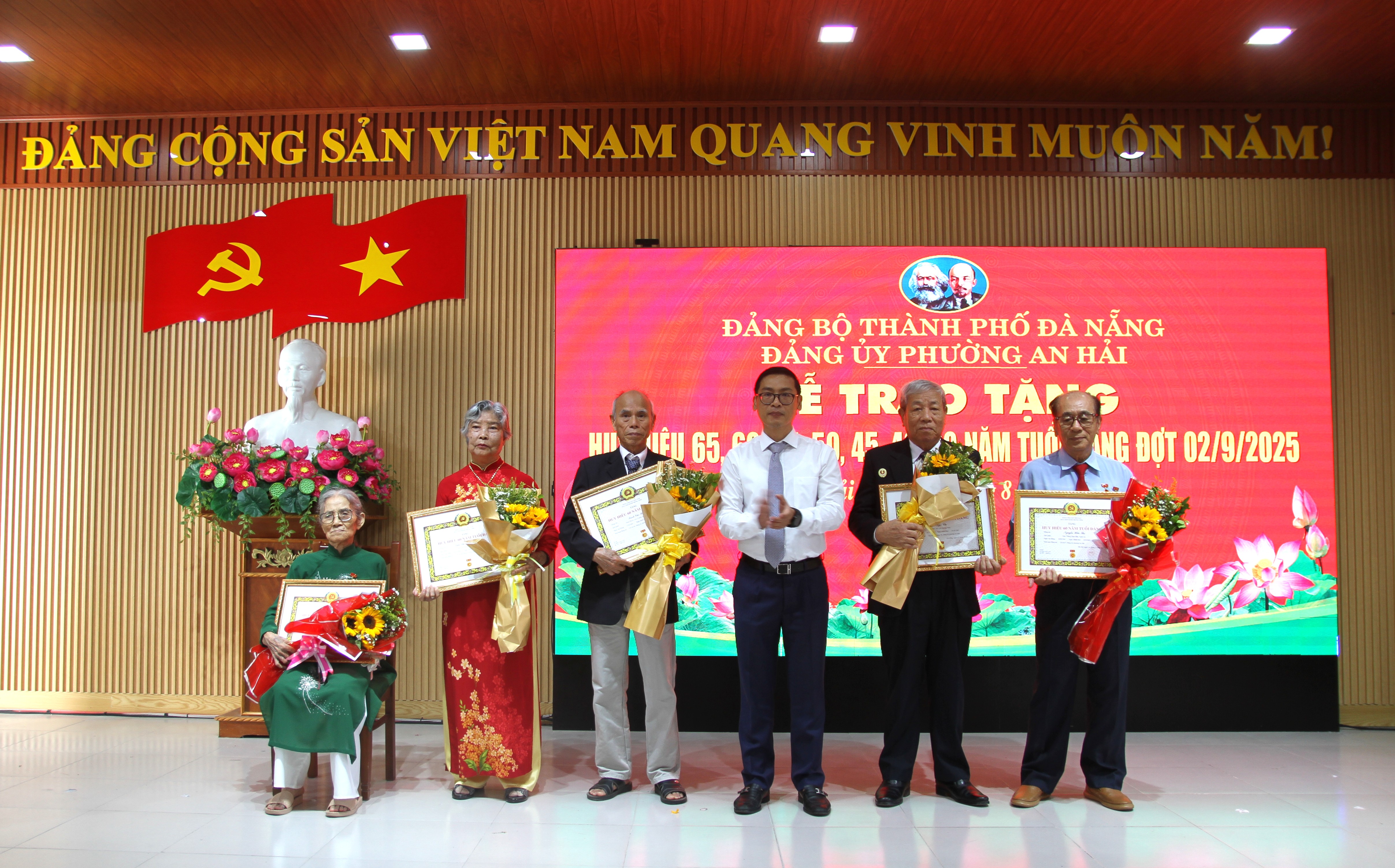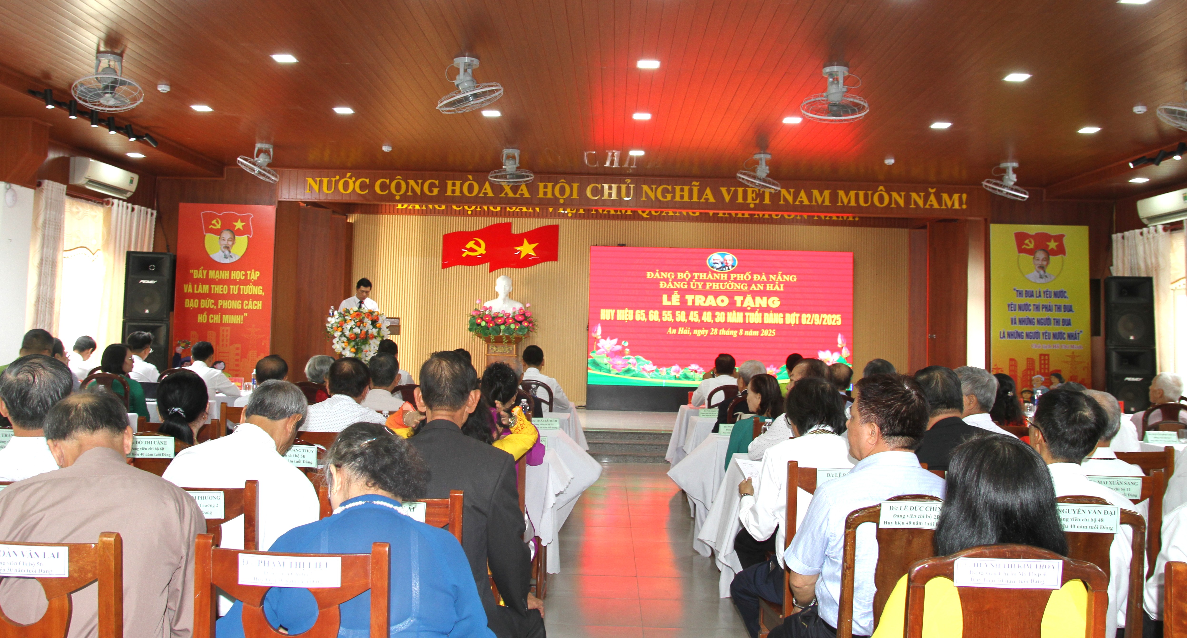 Sáng ngày 27/8/2025, Đảng ủy phường An Hải trang trọng tổ chức Lễ trao Huy hiệu Đảng đợt 02/9 cho các đảng viên lão thành đang sinh hoạt tại địa phương. Tham dự buổi lễ có các đồng chí: Nguyễn Trọng Hùng - Phó Trưởng ban Tổ chức Thành ủy; Phạm Thị Thảo Nguyên - Phó Trưởng ban Tuyên giáo và Dân vận Thành ủy; Phùng Phú Phong - Bí thư Đảng ủy, Chủ tịch HĐND lâm thời phường; Nguyễn Thị Anh Thảo - Phó Bí thư Thường trực Đảng ủy; Hoàng Công Thanh - Phó Bí thư, Chủ tịch UBND phường; cùng các đồng chí trong Ban Thường vụ Đảng ủy và các đảng viên được trao Huy hiệu.