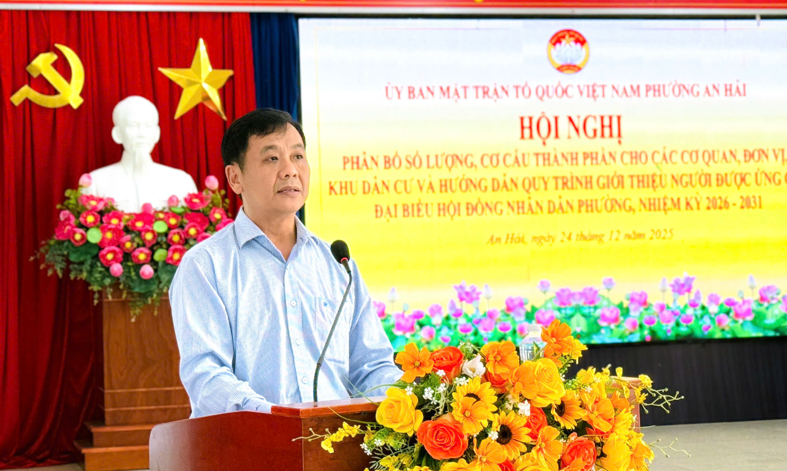 Sáng 24/12, Uỷ ban MTTQ Việt Nam phường An Hải tổ chức Hội nghị phân bổ số lượng, cơ cấu thành phần cho các cơ quan, đơn vị, khu dân cư và hướng dẫn quy trình giới thiệu người được ứng cử đại biểu Hội đồng nhân dân phường, nhiệm kỳ 2026 - 2031.