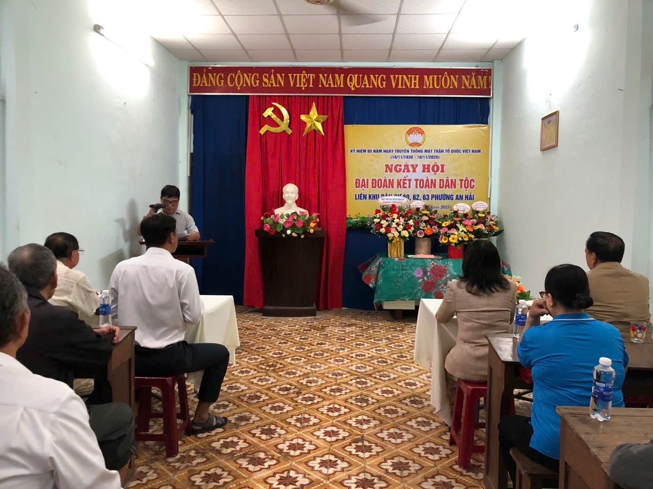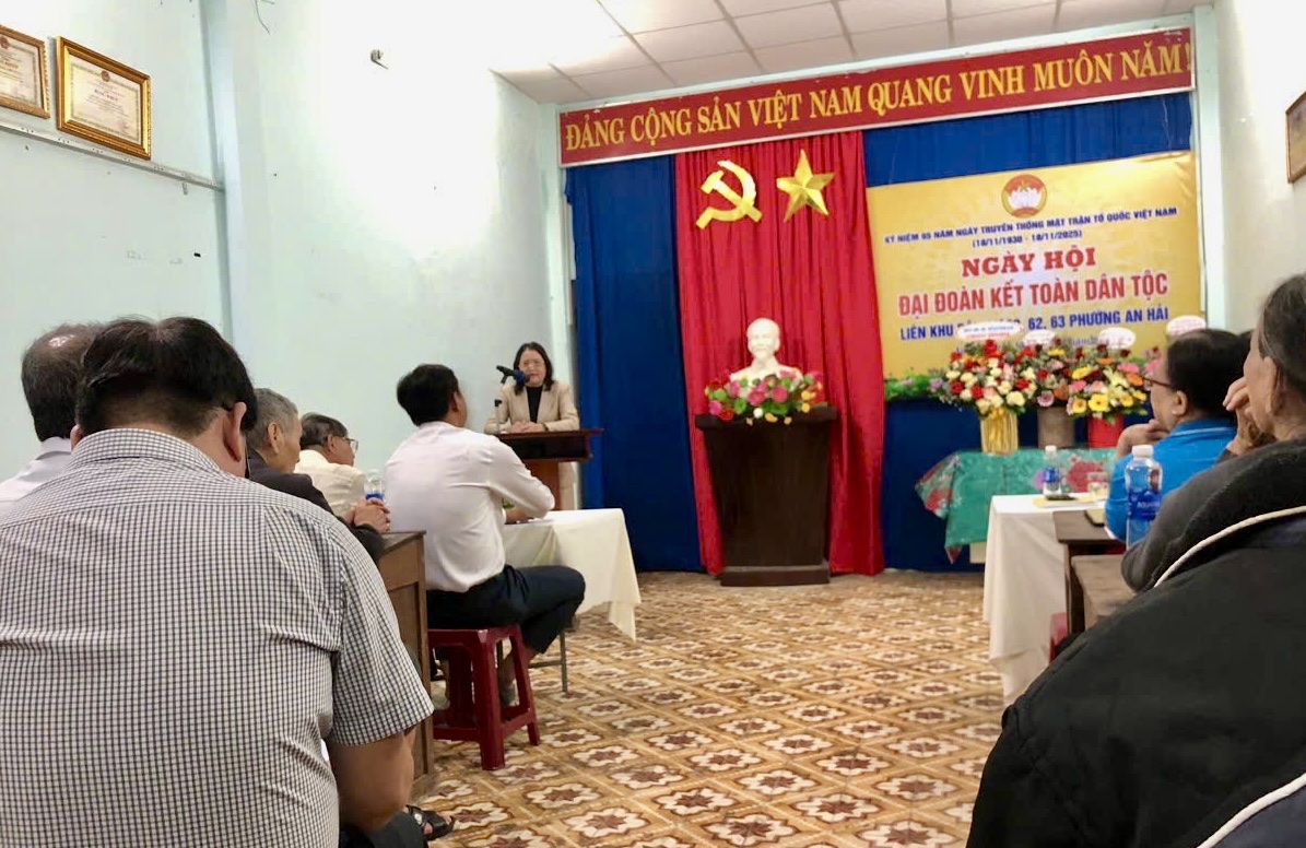 Tối 15/11, tại Nhà sinh hoạt cộng đồng số 71 đường Sương Nguyệt Ánh, liên Khu dân cư 60, 61 và 62 phường An Hải tổ chức Ngày hội Đại đoàn kết toàn dân tộc năm 2025, chào mừng kỷ niệm 95 năm Ngày Truyền thống Mặt trận Tổ quốc Việt Nam (18/11/1930 - 18/11/2025). Uỷ viên Ban Thường vụ Đảng uỷ, Phó Chủ tịch Thường trực UBND phường An Hải - Trần Thị Nhớ đã về dự, tặng hoa và quà chúc mừng và chung vui cùng bà con Nhân dân các khu dân cư.