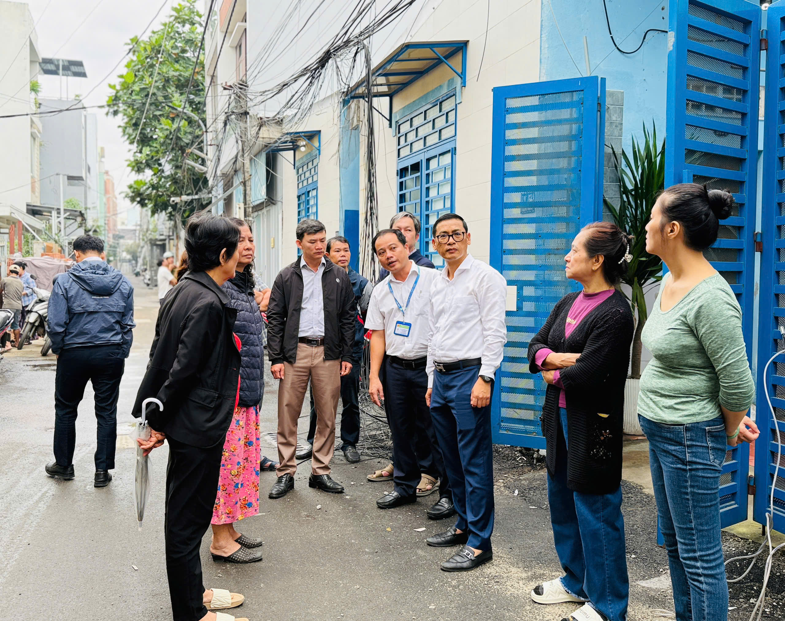 Bí thư Đảng ủy và các lãnh đạo phường kiểm tra thực tế và trao đổi với các hộ dân