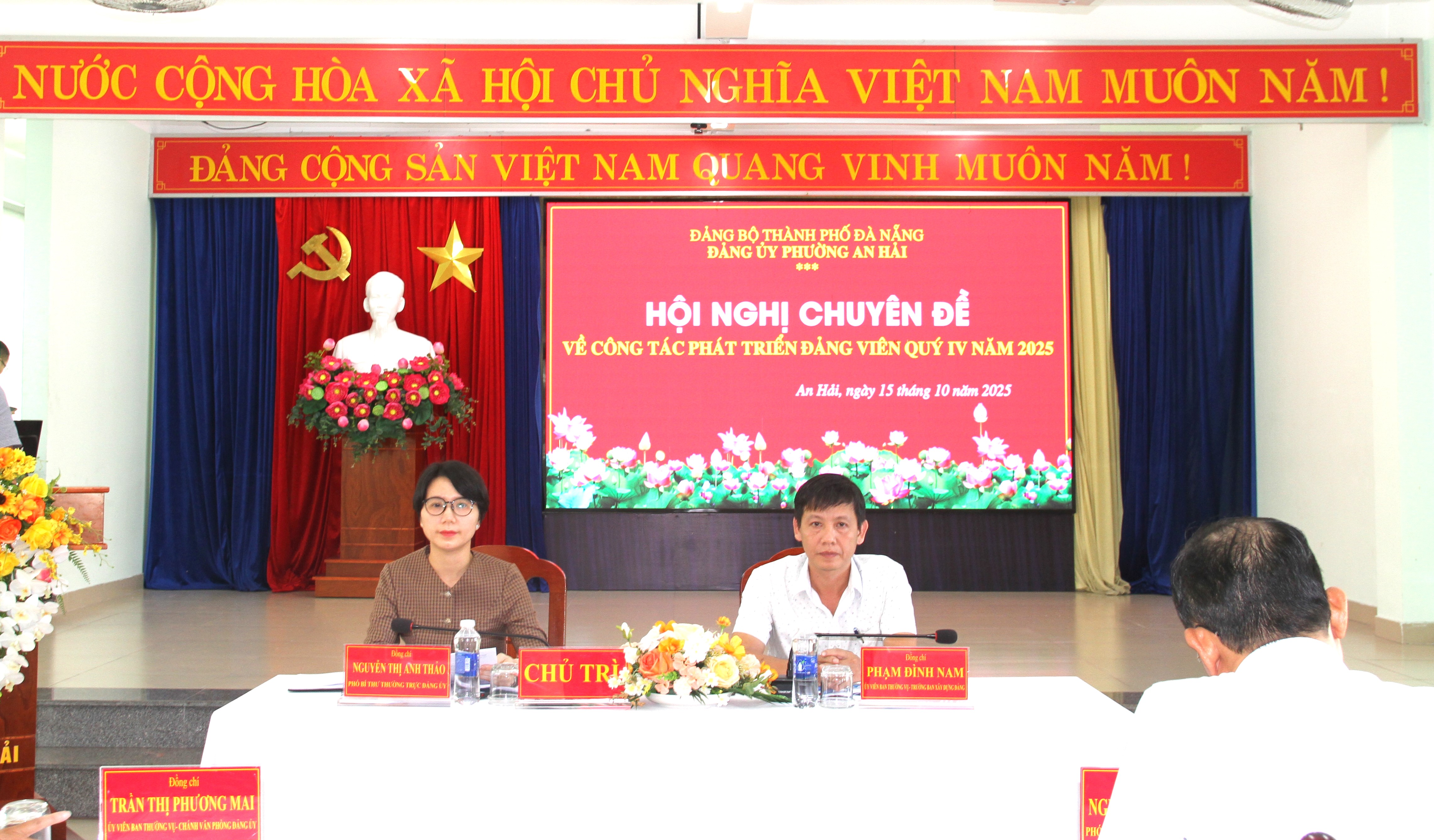 Chiều 15/10/2025, Ban Xây dựng Đảng Đảng ủy phường An Hải tổ chức Hội nghị chuyên đề về công tác phát triển đảng viên quý IV năm 2025. Tham dự Hội nghị có đồng chí Nguyễn Trọng Hùng - Phó Trưởng ban Ban Tổ chức Thành ủy Đà Nẵng; các đồng chí trong Ban Thường vụ, Ban Chấp hành Đảng bộ phường; Bí thư cùng cán bộ phụ trách công tác tổ chức đảng các chi, đảng bộ trực thuộc Đảng ủy phường. Phó Bí thư Thường trực Đảng ủy phường Nguyễn Thị Anh Thảo và Trưởng Ban Xây dựng Đảng Đảng ủy phường Phạm Đình Nam đồng chủ trì Hội nghị.